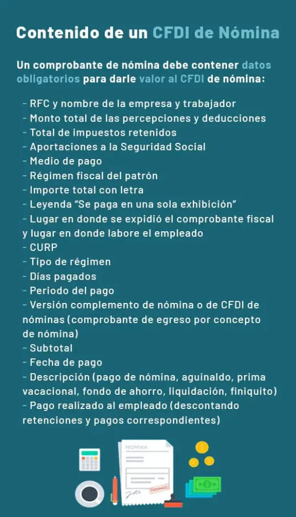 El CFDI de nómina debe emitirse de manera mensual y debe contener información detallada sobre los sueldos, deducciones, prestaciones y demás conceptos relacionados con la nómina de los empleados. Además, debe incluir el Registro Federal de Contribuyentes (RFC) tanto del empleador como del trabajador, así como otros datos fiscales relevantes.